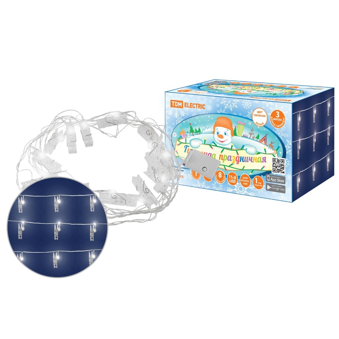 Это оригинальная гирлянда из маленьких белых огоньков, совмещенных с прищепками. В каждую из них можно закрепит маленький подарочек, сувенир, игрушку-украшение, открытку или фото. Все это можно поместить в ветвях новогодней ели или развесить в комнате. Предназначена для помещений. Светодиодные гирлянды торговой марки ТДМ Электрик излучают мягкий не слепящий свет и потребляют малое количество электроэнергии.